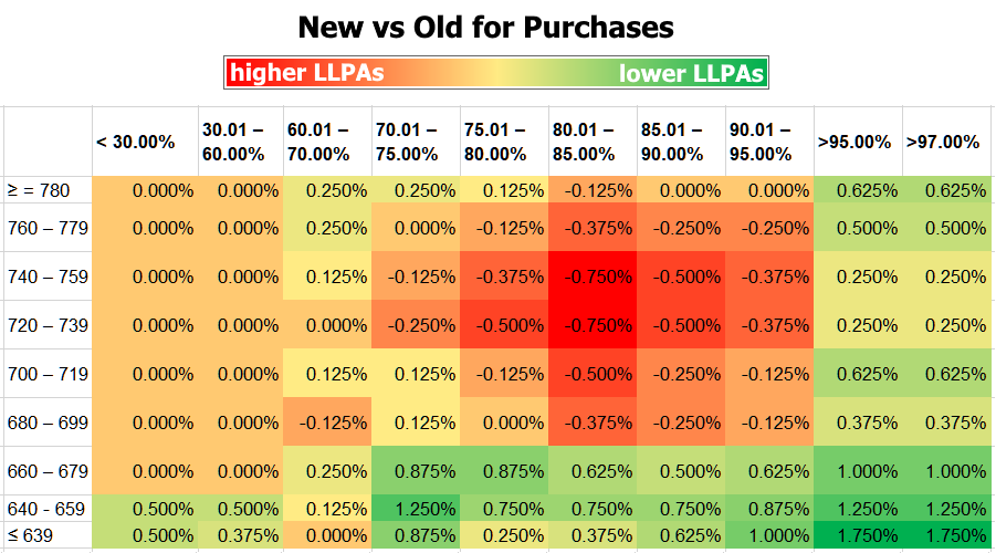Here’s a heat map that shows the new adjustments from FNMA. (source: Mortgage News Daily)